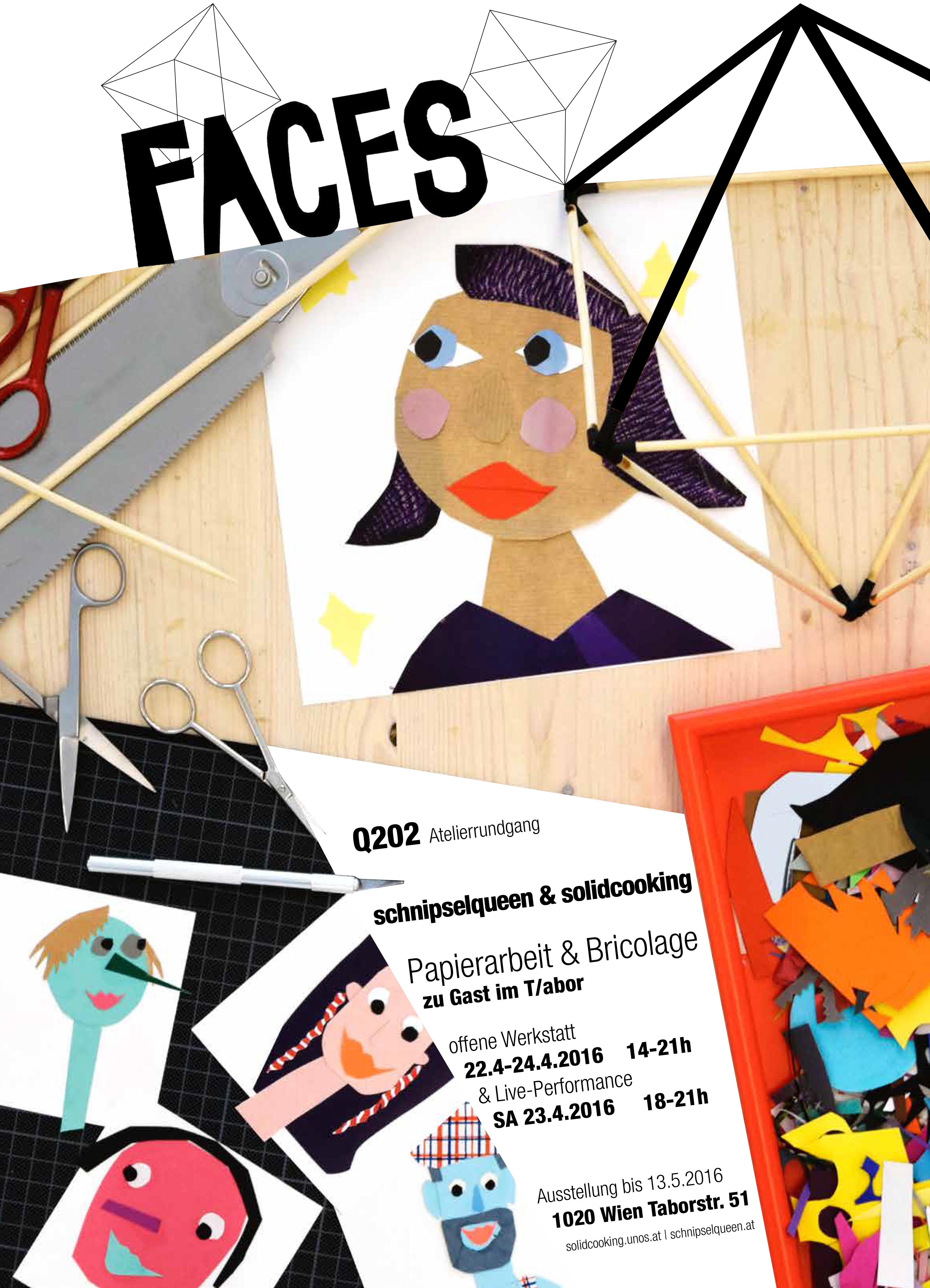 Im Rahmen des Atelierrundgangs Q202 öffnet der Ausstellungs- und Werkstättenraum T/abor seine Pforten. FACES vereint die Collagen der Papierkünstlerin schnipselqueen und die Objekte des Künstler- und Architektenduos unos. Der kreative Umgang mit vorgefundenen Materialien und die Einladung zur humorvollen Grenzüberschreitung verbindet ihre Arbeit. Während der offenen Workshops wird an einem überdimensionalen Leuchtobjekt gearbeitet, das aus einer Vielzahl individueller Gesichter in dreidimensionalen Rahmenobjekten erwächst. Jeder kann mitmachen, Papier-Portraits und DIY-Rahmen gestalten und Teil des Gesamtobjektes werden.